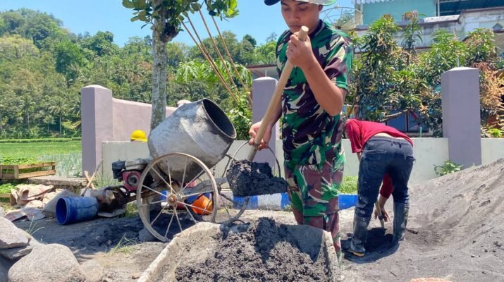 Anggota Satgas TNI Manunggal Membangun Desa (TMMD) ke-126 Kodim 0818/Malang-Batu dari Yonzipur 5, Praka I Wayan Juliawan, bersama rekan-rekannya, terus menunjukkan semangat dan dedikasi