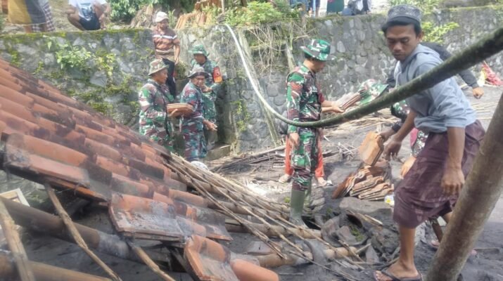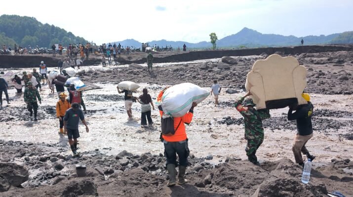 Lumajang — Upaya pemulihan pasca banjir lahar dingin Gunung Semeru terus dilakukan oleh jajaran Kodim 0821/Lumajang. Serda Didik, bersama enam personel lainnya,