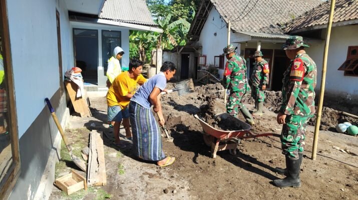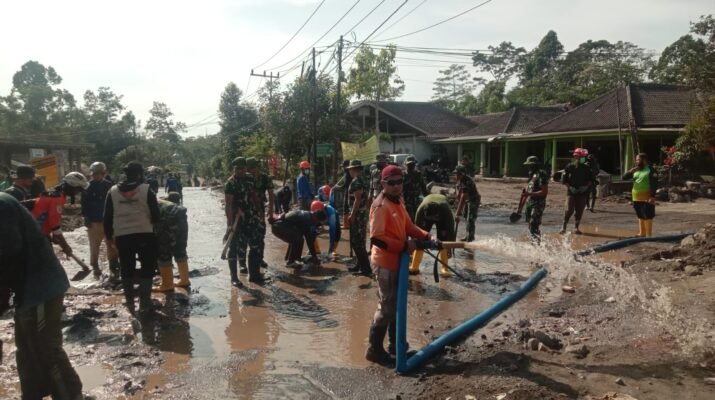 Lumajang – Upaya pemulihan pasca erupsi Gunung Semeru terus digencarkan. Personel gabungan Kodim 0821/Lumajang dan Yonif 527/BY turun langsung membantu warga membersihkan material