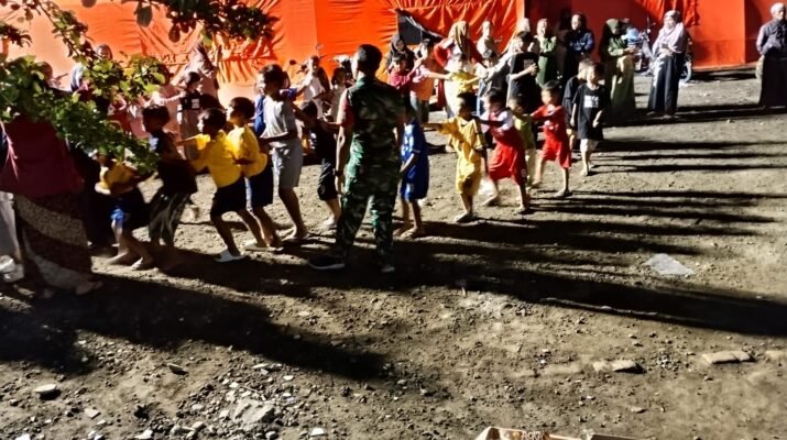 Babinsa dan Relawan Gelar Permainan Edukatif untuk Pulihkan Psikis Anak-Anak Pengungsi di Pronojiwo.