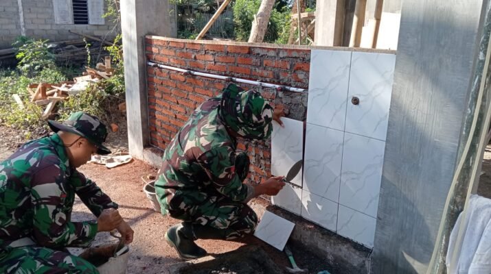 Anggota Satgas TMMD bersama masyarakat setempat bergotong royong melanjutkan pembangunan fisik berupa dinding penampungan air menggunakan material bata merah dan keramik pelapis. Progres pembangunan menunjukkan hasil yang positif dan terus dikebut guna mendukung kebutuhan air bersih warga sekitar.